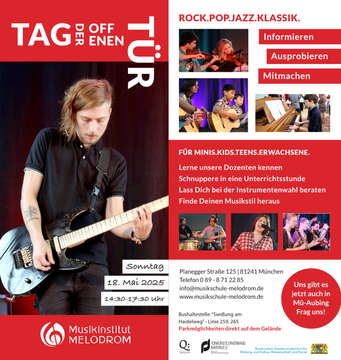 Beim Tag d. offenen Tür können Sie sich unverbindlich und kostenlos über alle unsere Musikschulangebote informieren. Probieren Sie Ihr Wunschinstrument aus und lernen Sie dabei unsere Dozenten kennen. Wir beraten Sie gerne bei Ihren Fragen rund um Ihr Lieblingsinstrument.